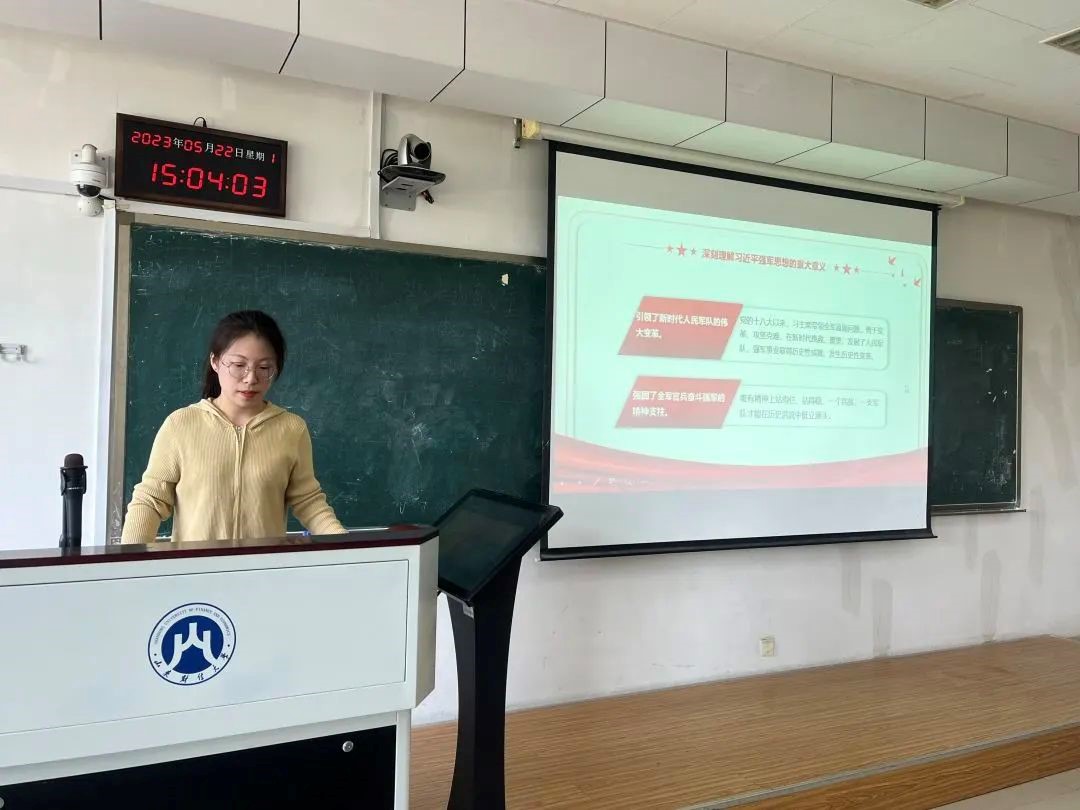 首先,刘玉婷同学带领大家学习了习近平总书记强军思想的重大意义及主要内容。强军实践永不止步,理论创新没有止境。习近平强军思想,立足新时代强军兴军实践,提出一系列标志性引领性的新理念新思想新战略。这一思想的主要内容,集中体现在“十一个明确”的新概括,充分彰显了党的军事指导理论的时代性、开放性和创造性,为我军始终在党的旗帜下有效履行使命任务提供了根本遵循、指明了前进方向。